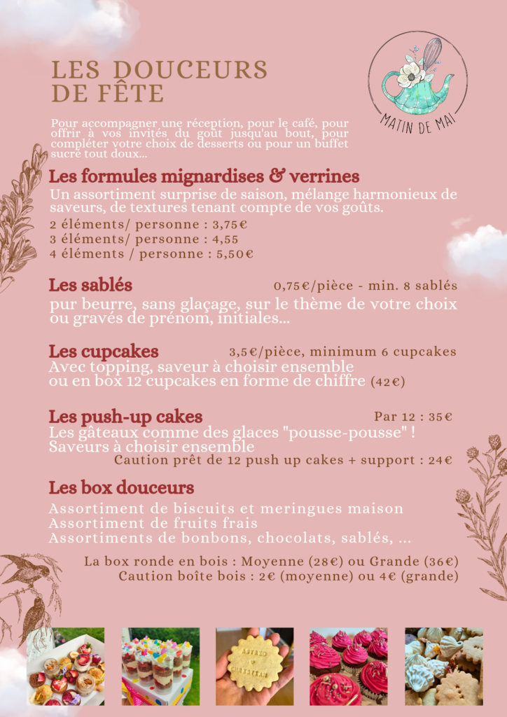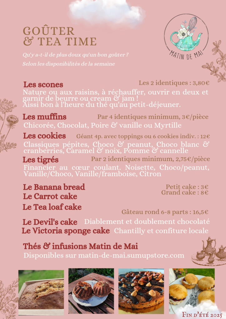 Plats ou desserts en click and collect la semaine, offres thématiques, brunchs, offres spéciales, épicerie (thés, infusions, préparations du moment…), n’hésitez pas à visiter régulièrement la boutique pour vous régaler en soutenant Matin de Mai !